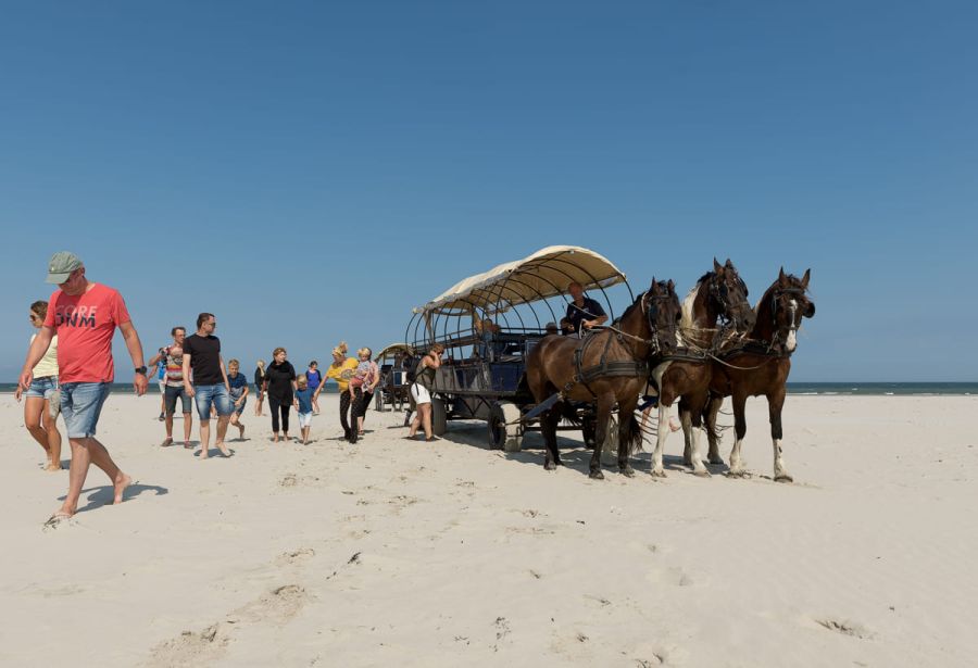 Een 2,5 uur durende Strand Boschplaat huifkartocht. Genieten van een huifkartocht door bos, duinen, langs cranberryvelden, over het strand en de Boschplaat.